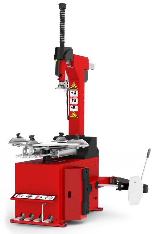 Automatic tyre changer featuring inverter technology designed for fast mounting and de-mounting with low power consumption and high torque. The motor is directly coupled with a belt free inverter gear box ensuring no slippage even with larger tyres. It offers variable speed operation from 5 to 22 rpm to prevent tyre breakage. The machine includes a square type bed with self centering four jaw claws and pneumatically operated twin cylinders for secure clamping. A pneumatic powered tilted column can be tilted back and forth and locked by an air cylinder while a specially coated cylinder prevents rust to increase service life. The 41mm diameter hex bar de-mounting head is made of special material to handle run flat and low profile tyres. The pedal assembly features an ergonomic design and robust structure. Specifications include an outside clamping range of 10 to 21 inches and an inside clamping range of 12 to 24 inches handling rim widths from 3 to 12 inches and a maximum wheel diameter of 960 mm. The working pressure operates between 8 to 10 bar with a bead breaking force of 2500 kg. Power supply is 230 V driving a 0.75 kW motor. The machine operates with a noise level under 70 dB.