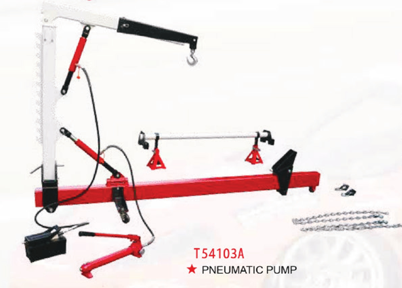 Model: T54103A. Capacity: 10 ton. Pneumatic hydraulic pump for faster and easier operation. Suitable for professional automotive body shops.