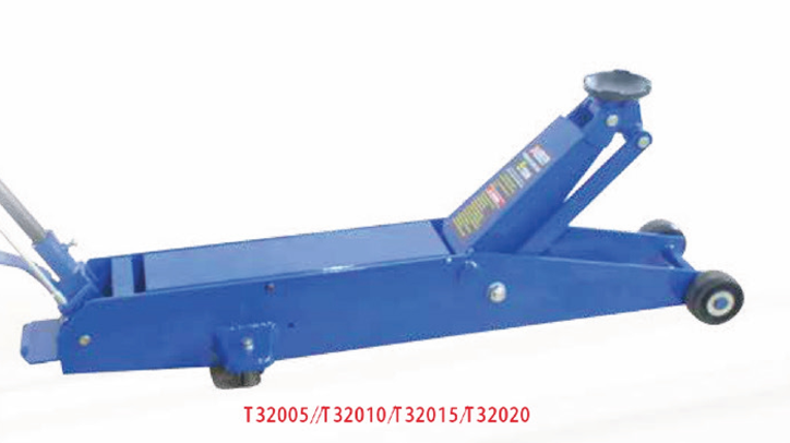Available models: T32005 (5 ton), T32010 (10 ton), T32015 (15 ton), T32020 (20 ton). Min height range: 160–220 mm. Max height range: 560–680 mm. Net weight range: 90–215 kg. Gross weight range: 100–230 kg. Heavy-duty long chassis hydraulic floor jack designed for workshop and industrial vehicle lifting applications.