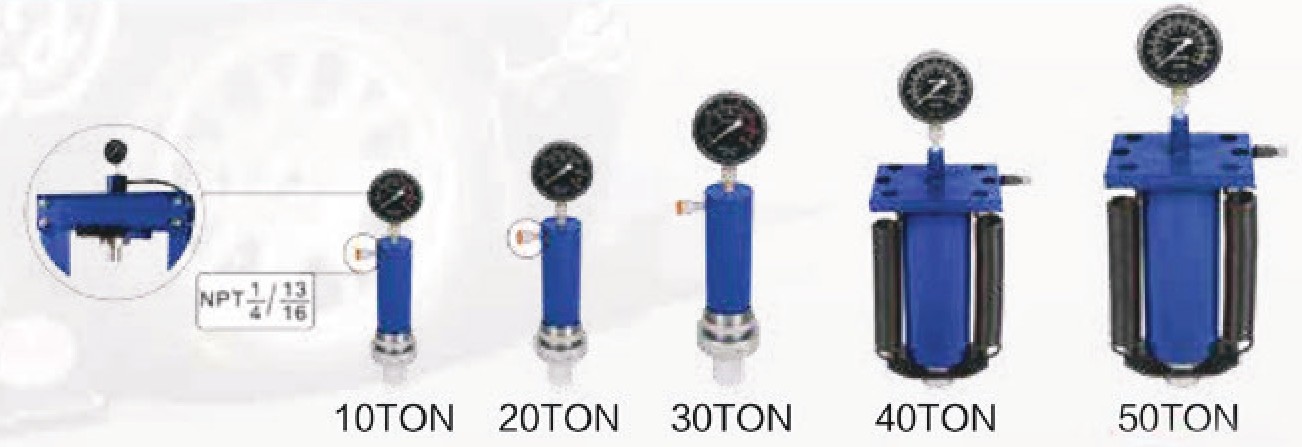 Available capacities: 10 ton, 20 ton, 30 ton, 40 ton, 50 ton. Built-in pressure gauge for accurate force monitoring. Designed for hydraulic shop presses in automotive, fabrication, and industrial workshops.