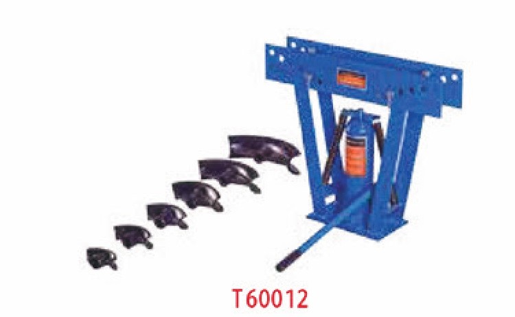 Model: T60012. Capacity: 12 ton. Base die sizes: 1/2″, 3/4″, 1″, 1-1/4″, 1-1/2″, 2″. Net weight: 36 kg. Gross weight: 38 kg. Package size: 630×540×170 mm. Designed for precision pipe bending in automotive, plumbing, and fabrication workshops.