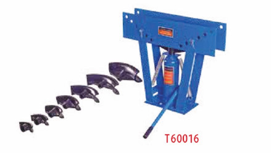 Model: T60016. Capacity: 16 ton. Base die sizes: 1/2″, 3/4″, 1″, 1-1/4″, 1-1/2″, 2″, 2-1/2″, 3″. Net weight: 60 kg. Gross weight: 63 kg. Package size: 680×610×210 mm. Heavy-duty pipe bender for professional workshop use.