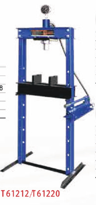 Available models: T61212, T61212A, T61212F. Capacity: 12 ton, Stroke: 135 mm, Max working distance: 858 mm, Net weight: 72 kg, Gross weight: 74 kg, Package size: 1320×220×210 mm. Heavy-duty hydraulic shop press with pressure gauge, ideal for automotive repair, bearing service, and general workshop pressing applications.