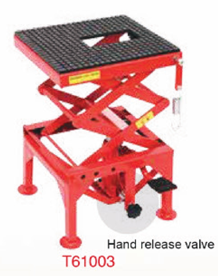 Motorcycle lift table equipped with hand release valve for controlled lowering. Supports up to 300 lbs capacity with lifting height range from 345mm to 865mm. Provides stable working platform for repair and maintenance applications.